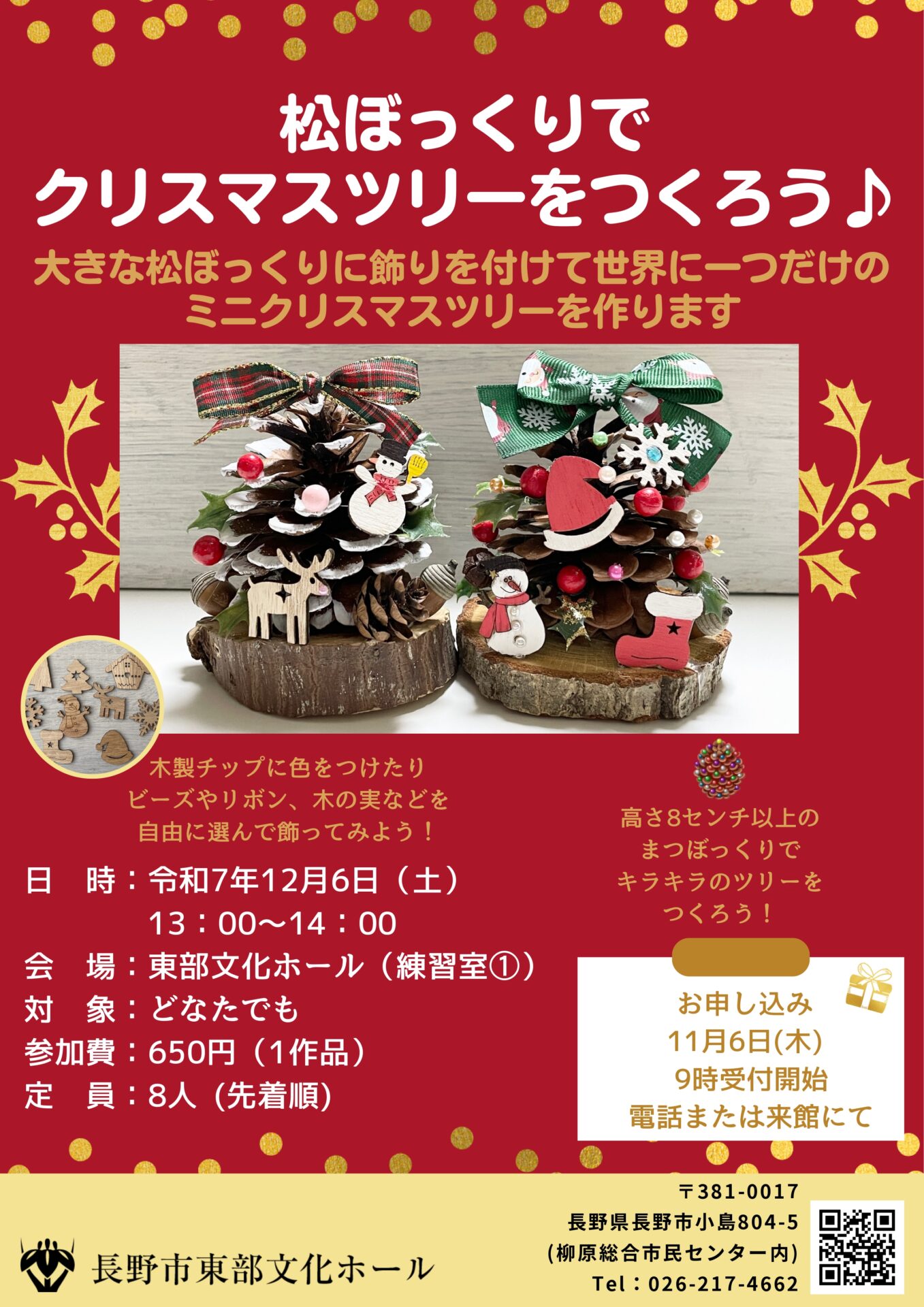 『松ぼっくりでクリスマスツリーをつくろう♪』を開催します。 高さ8センチ以上の大きな松ぼっくりに飾りを付けて 世界に一つだけのミニクリスマスツリーを作ります。 日時:12月6日(土)13:00~14:00会場:東部文化ホール(練習室①)対象:どなたでも参加費:650円(1作品) ※みらいハッケンプロジェクトのポイントも使えます定員:8名(先着順) 11月6日(木)午前9時より申込受付開始します! お電話お待ちしております📞