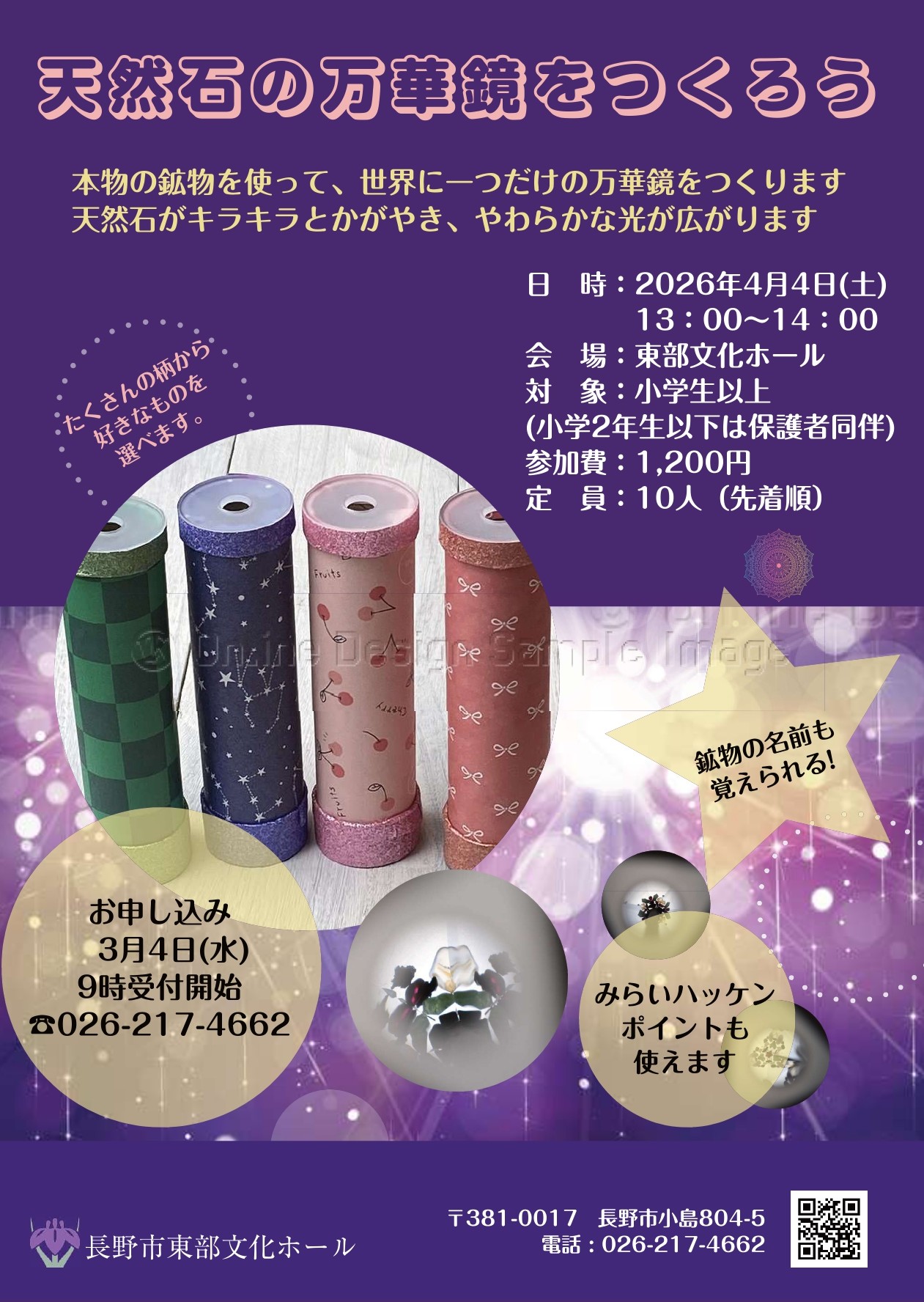 『天然石の万華鏡をつくろう』を開催します。 本物の鉱物を使って、世界に一つだけの万華鏡をつくります。 天然石がキラキラと輝き、やわらかな光が広がります。 日時:4月4日(土)13:00~14:00会場:東部文化ホール(練習室①)対象:小学生以上参加費:1,200円 ※みらいハッケンプロジェクトのポイントも使えます定員:10名(先着順) 3月4日(水)午前9時より申込受付開始します! お電話お待ちしております。